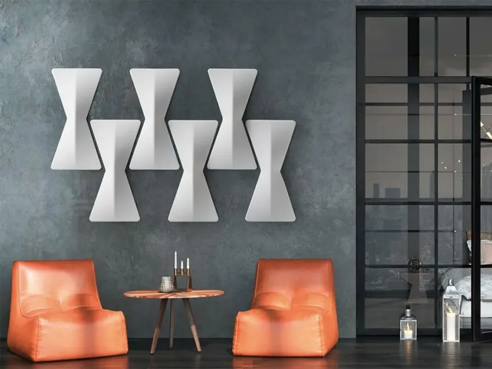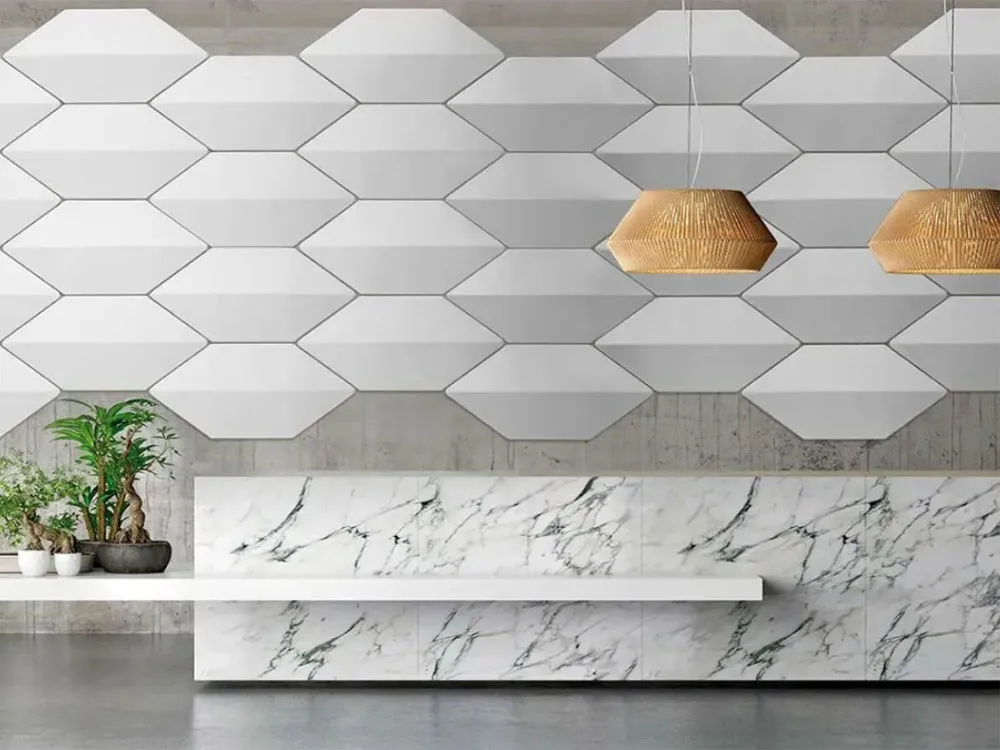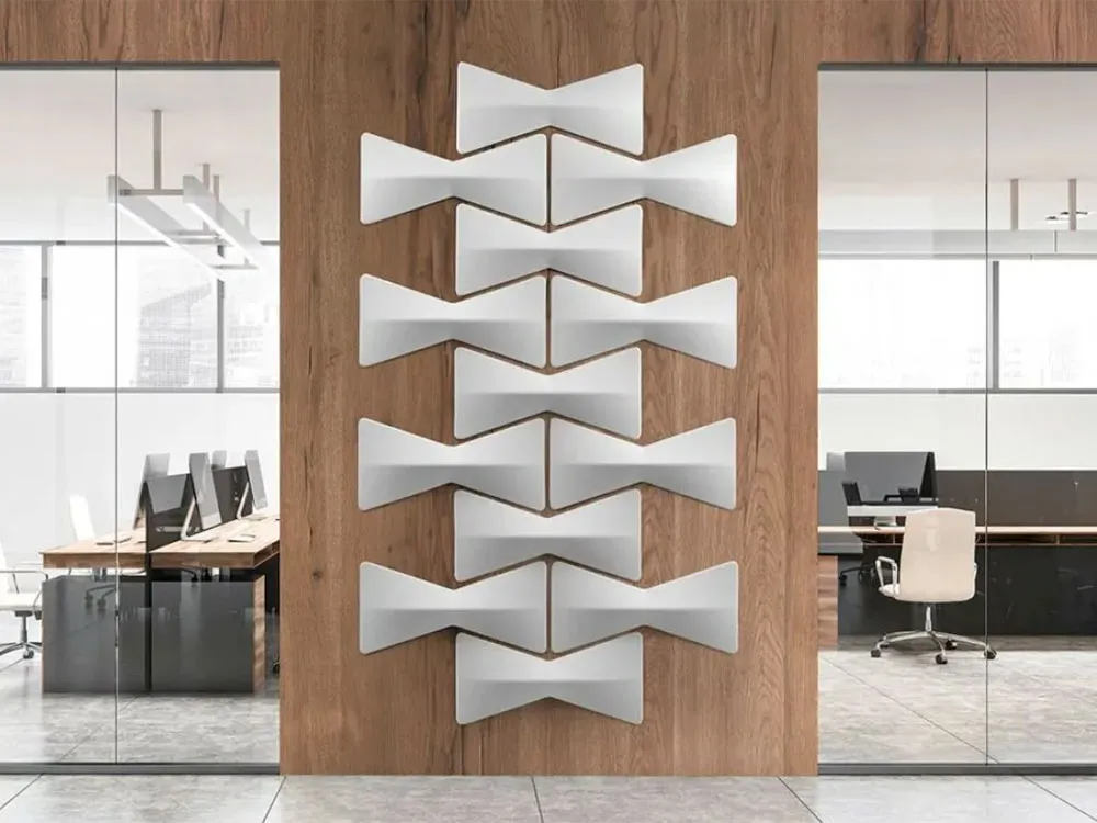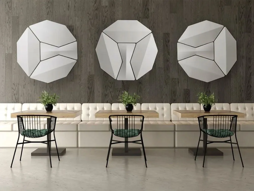 Le due sagome sono componibili e possono generare svariate composizioni. La tridimensionalità dei pannelli, oltre ad aumentare le performance acustiche, crea interessanti bassorilievi e giochi di luce. Gli elementi vengono fissati a parete e a soffitto tramite particolari attacchi in metallo e magneti che rendono i pannelli facilmente posizionabili e rimovibili.