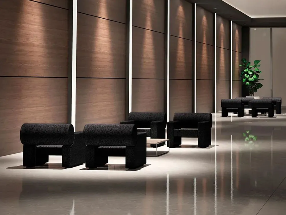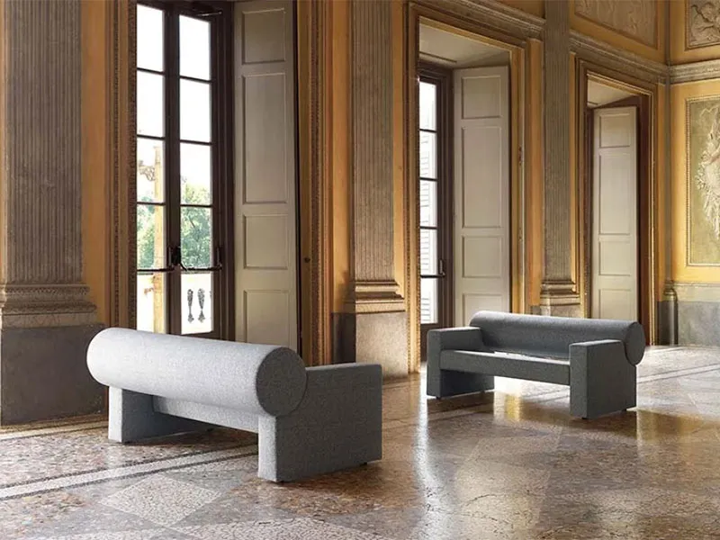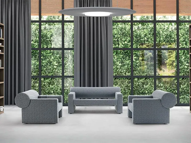 Cilindro è un divano fonoassorbente con struttura in materiale ligneo e copertura composta da imbottitura interna in tecnopolimero fonoassorbente, rivestito esternamente in tessuto Snowsound-Fiber Textiles 3 Melange o 8 Bouclè.