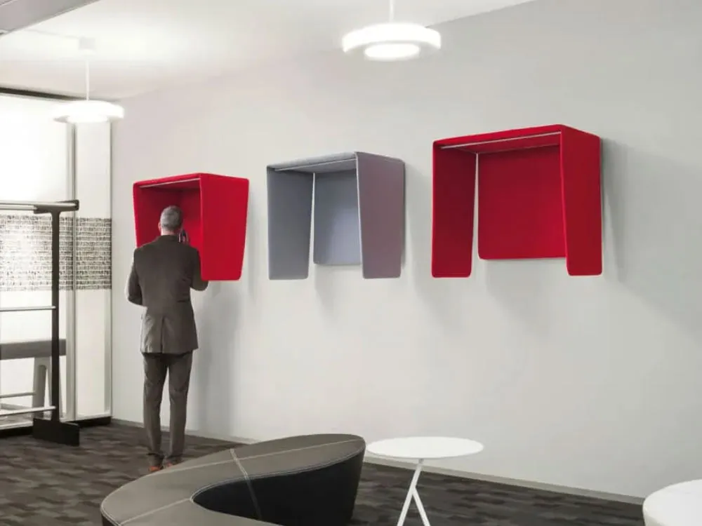 Cocker è un confortevole phone booth composto da un'imbottitura interna in poliestere morbida e fonoassorbente, da un rivestimento in poliestere Trevira CS® completamente sfoderabile e da una struttura portante indipendente, realizzata in tondino d'acciaio cromato. I fianchi morbidi e mobili sono appositamente studiati per muoversi liberamente se urtati accidentalmente.