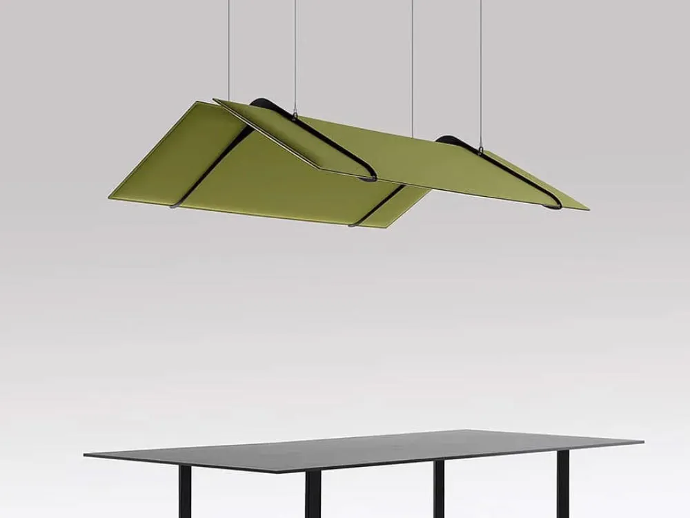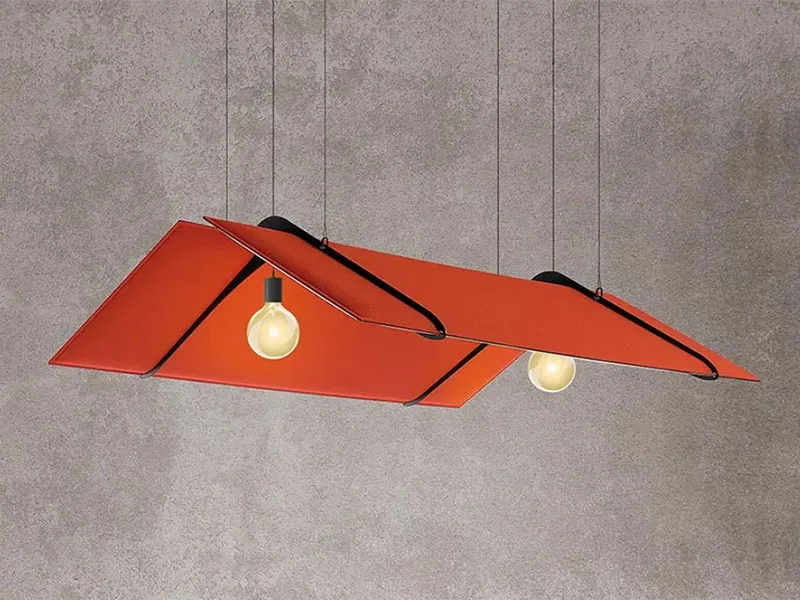 Pagoda è un paralume fonoassorbente, la struttura in acciaio verniciato supporta due pannelli Snowsound disponibili in varie dimensioni. I pannelli sono disposti a falde inclinate distanziati tra loro per poter far passare le diverse sorgenti luminose. I cavi di sospensione sono regolabili in altezza.