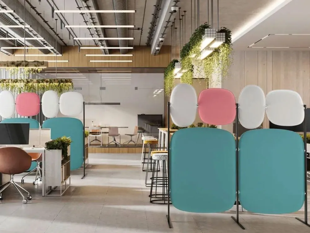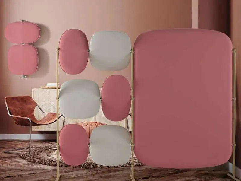 Paretine fonoassorbenti modulari, composte da pannelli con forme e colori ispirati alle gemme preziose, realizzati con tecnologia Snowsound. I montanti sono realizzati in acciaio verniciato con polveri epossidiche collegati tra loro da tubolari nei quali vengono inseriti i pannelli fonoassorbenti. Le strutture consentono di creare divisori singoli o modulari collegati tra di loro.