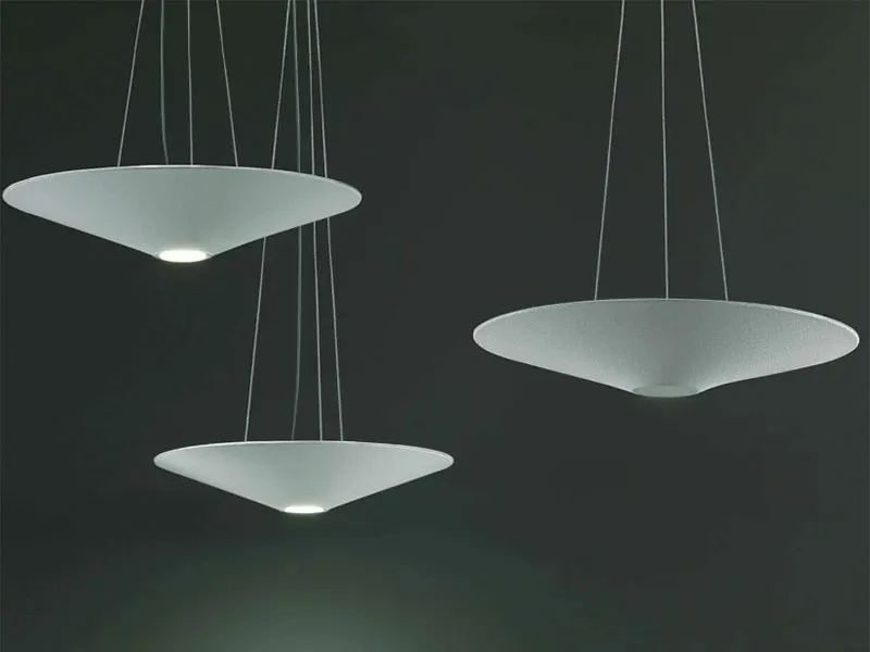 Elementi fonoassorbenti tridimensionali a soffitto, realizzati con tecnologia Snowsound, proposti con o senza luce Led integrata. Ogni elemento è dotato di 3 cavi per sospensione a soffitto in acciaio cromato collegati ad ununica piastra centrale. La linea estremamente leggera di TL nasconde al suo interno la tecnologia Snowsound che consente di assorbire il rumore. TL nasce da un progetto di Gio Ponti che nel 59 realizza lauditorium del Time Life Building a New York e, per il soffitto, progetta degli elementi conici che oggi vengono proposti da Caimi anche come elementi singoli.