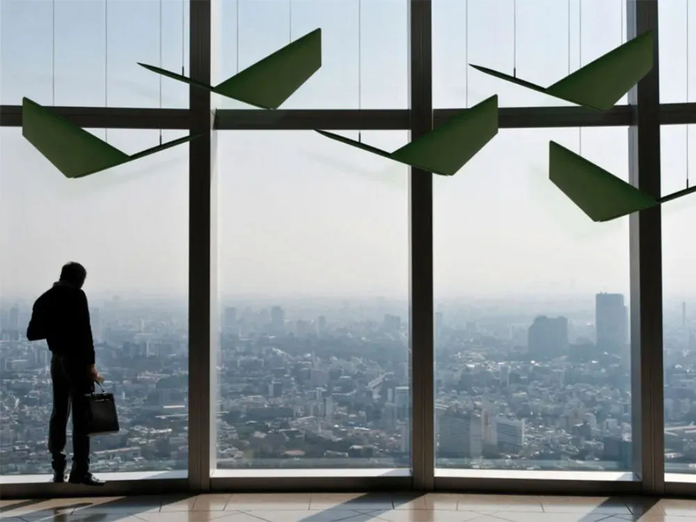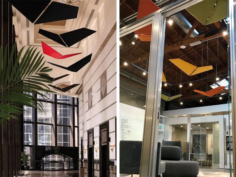 Con V-Flap si possono realizzare soluzioni fonoassorbenti di grande impatto visivo. Il telaio in acciaio cromato, tenuto in sospensione da sottili cavi metallici, ed i due pannelli fonoassorbenti in posizione inclinata generano limmagine di due ali che volano nello spazio.