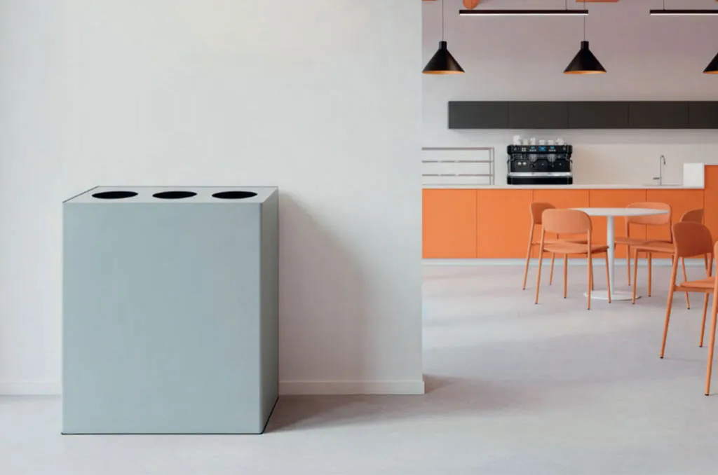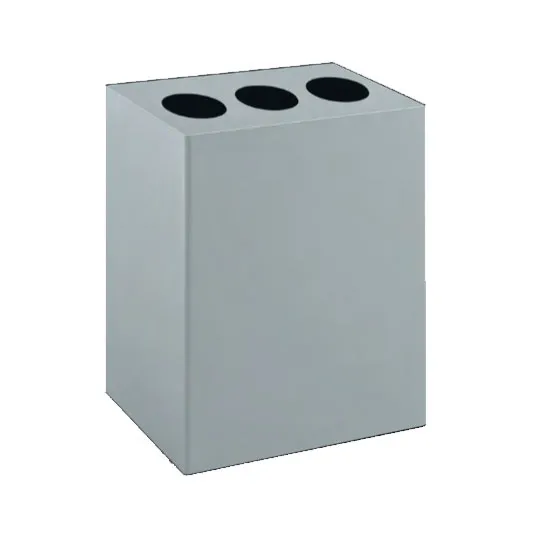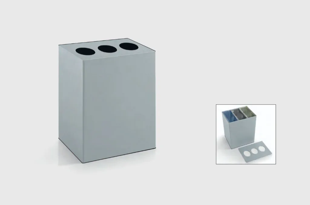 Cestino per la raccolta differenziata con fusto e base realizzati in lamiera di acciaio sp. 1 mm. verniciata con polveri epossidiche colore grigio argento, bordi perimetrali arrotondati. Suddiviso internamente in tre scomparti da divisori uniti solidamente alla struttura esterna. Coperchio superiore asportabile con 3 feritoie circolari per gettare i rifiuti nei 3 scomparti separatamente. Anelli reggisacchetto asportabili in acciaio verniciato.