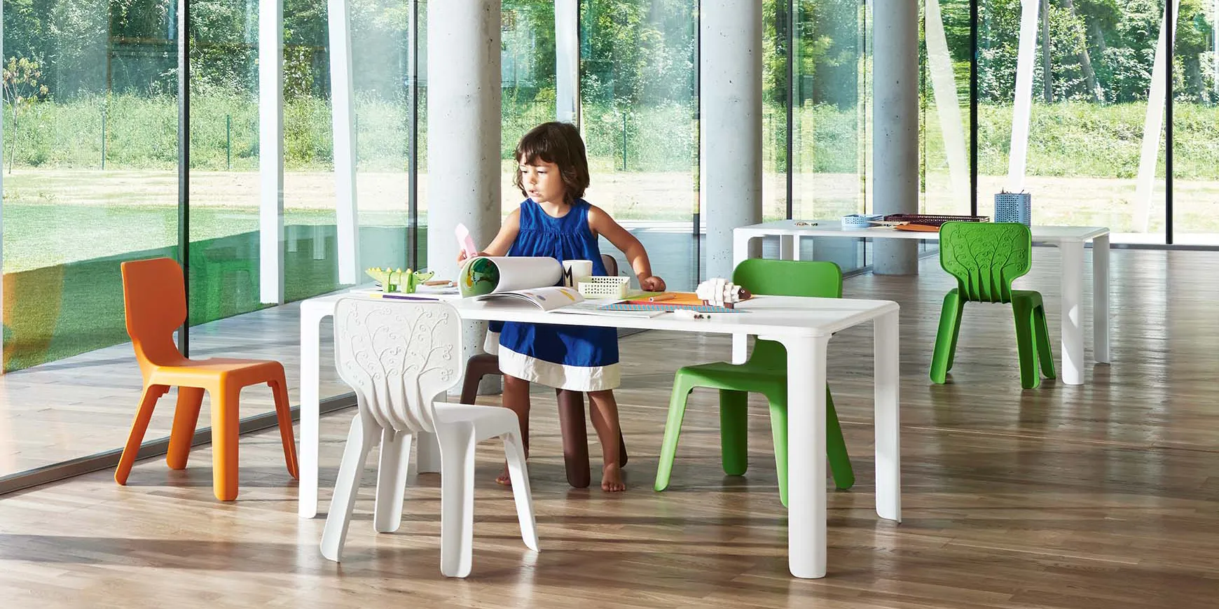 Tavoli per bambini Materiali: gambe in polipropilene caricato di fibra di vetro stampato ad iniezione standard. Piano in MDF rivestito di foglia polimerica.
