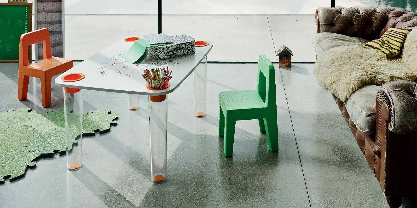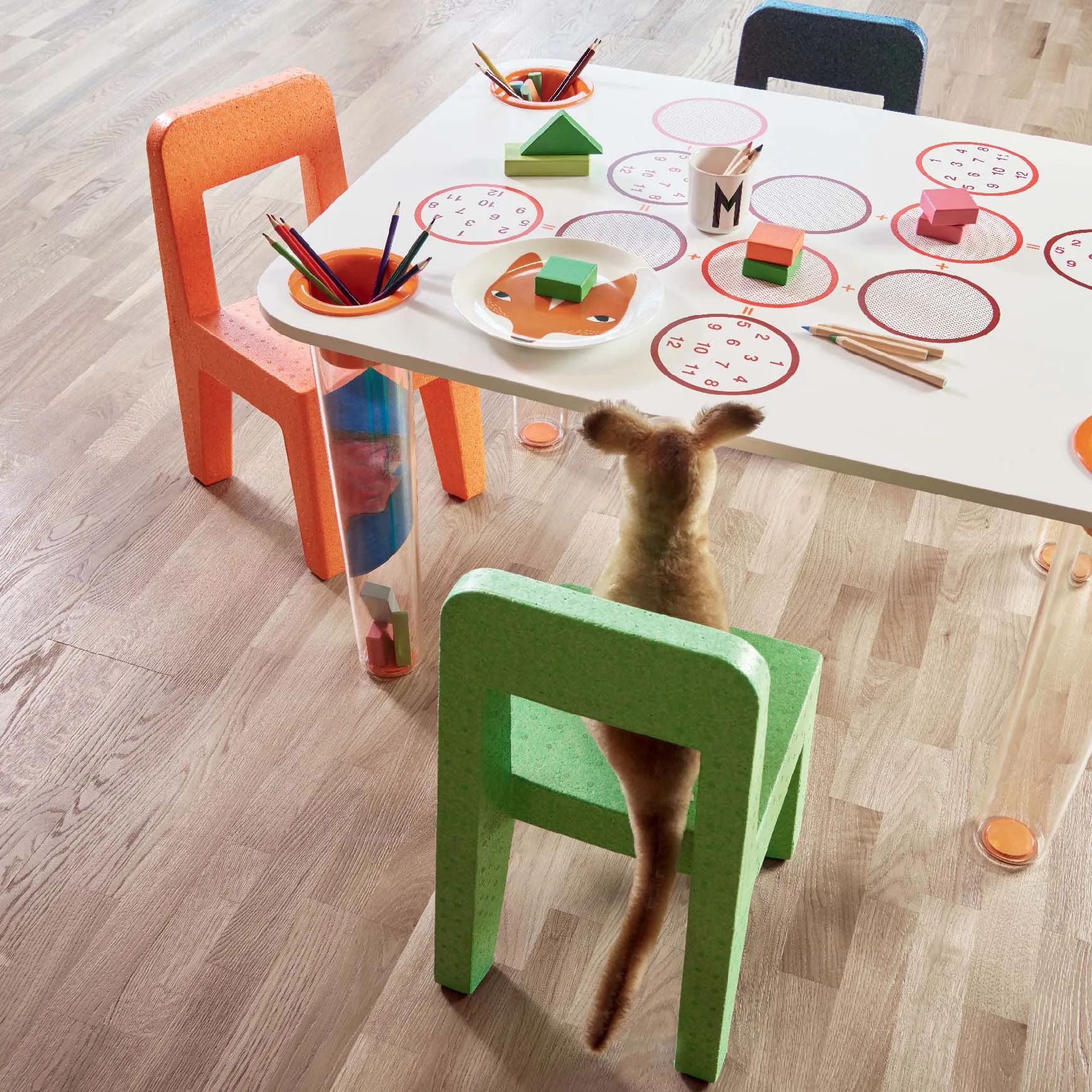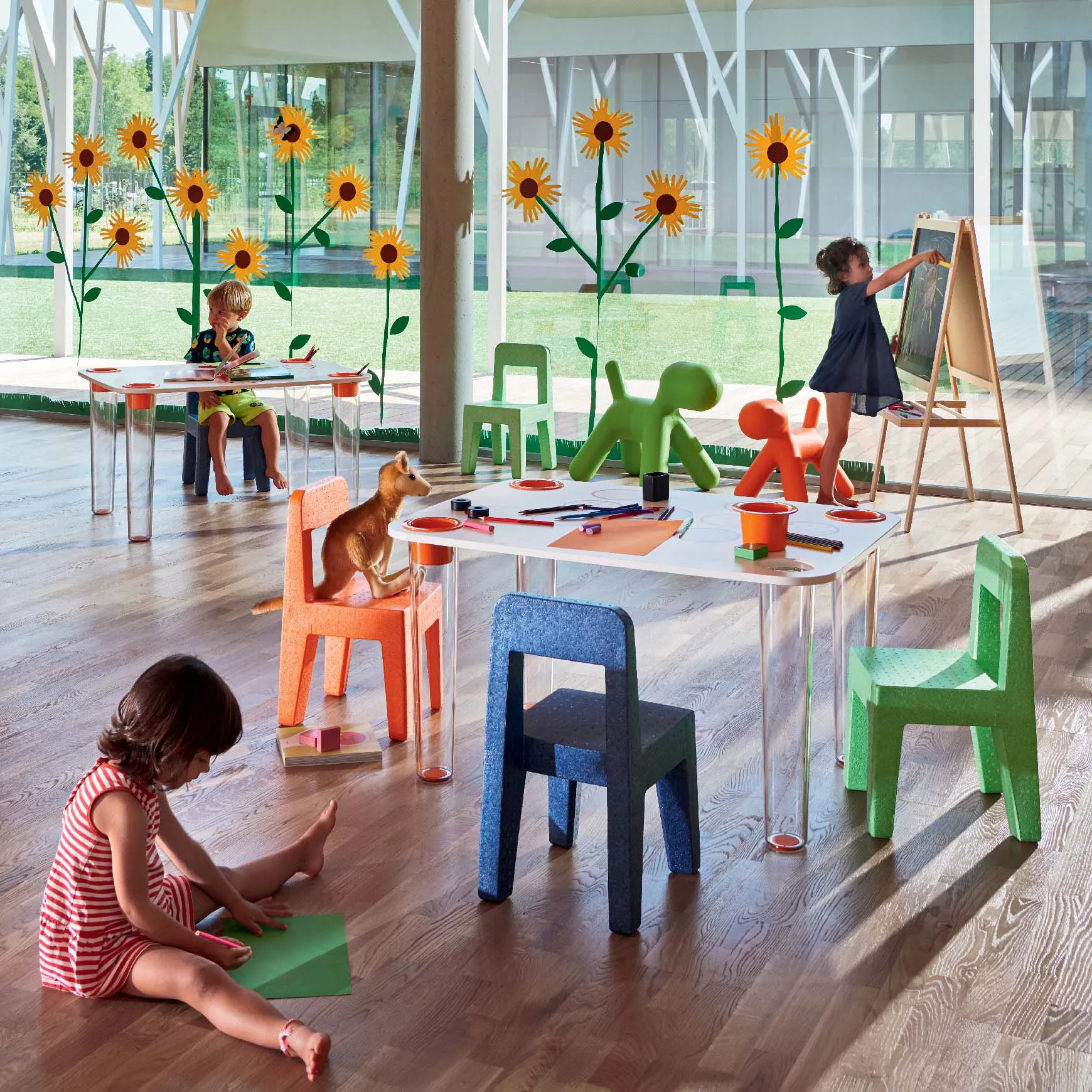 Tavolo per bambini con gambe in policarbonato trasparente e piano in MDF.