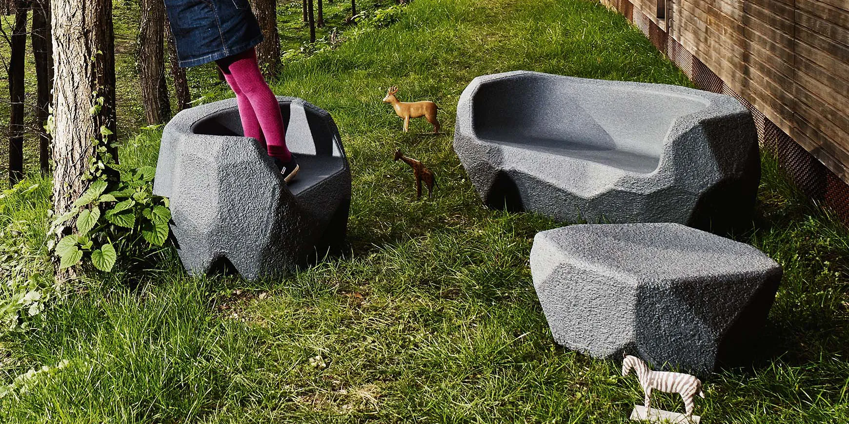 Famiglia di sedute (a 1 e 2 posti) e tavolino di appoggio Materiale: polietilene stampato in rotational moulding. Adatta anche per esterni.