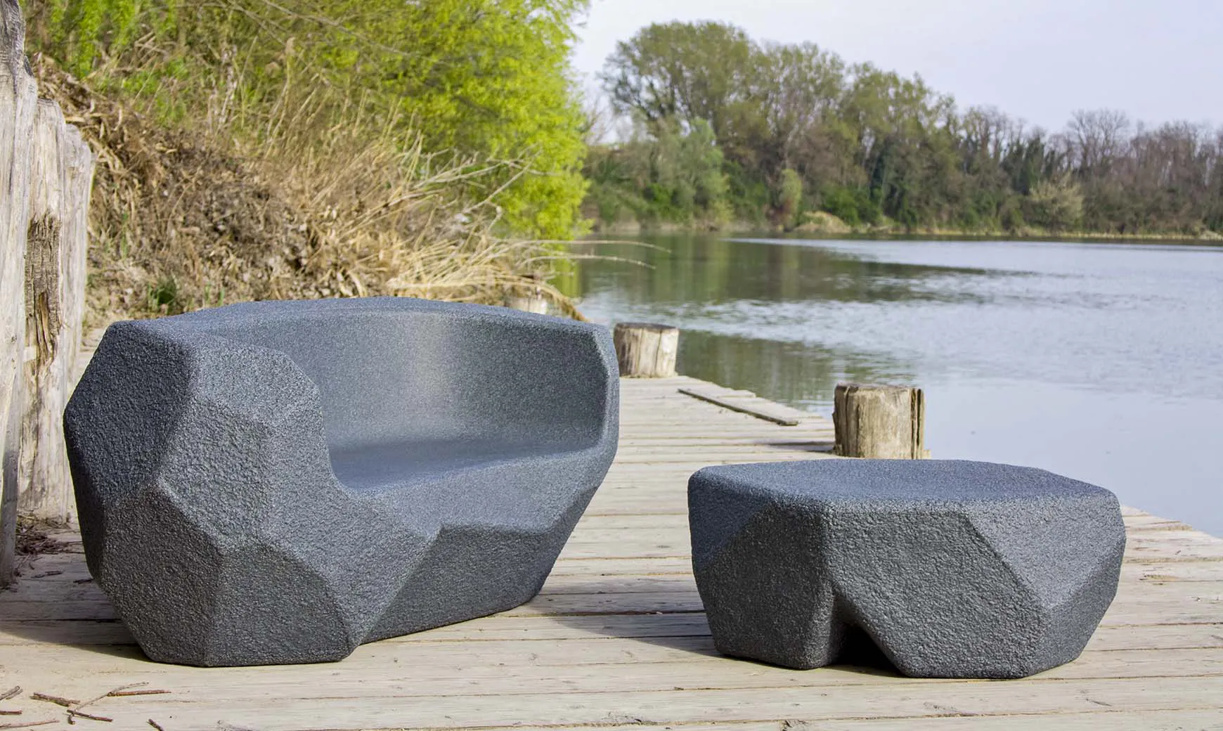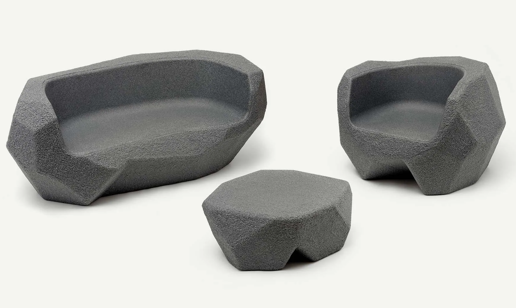 Sedute a 1 e 2 posti e tavolino della linea Piedras, realizzati in materiale plastico.