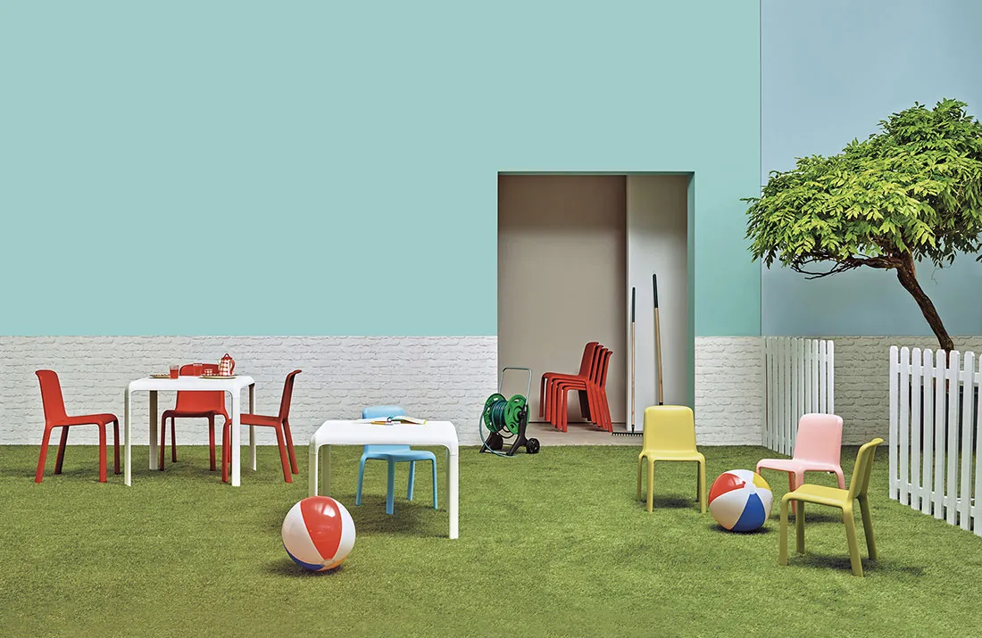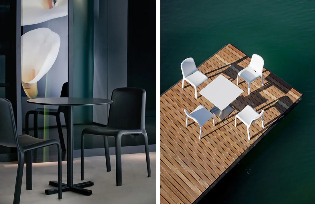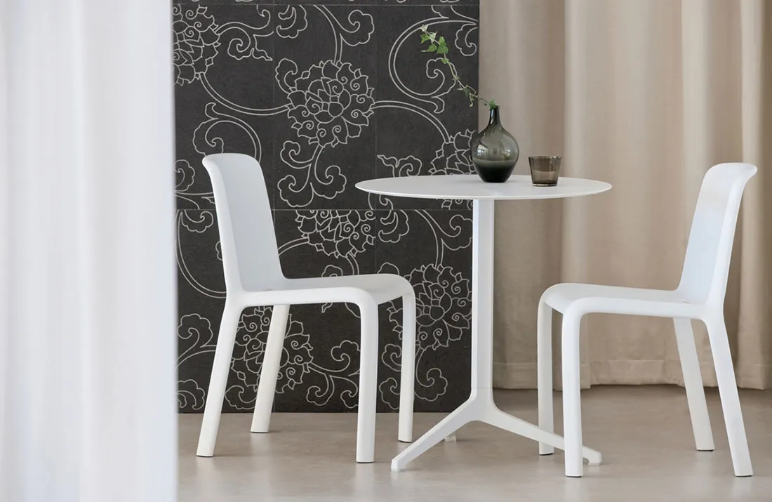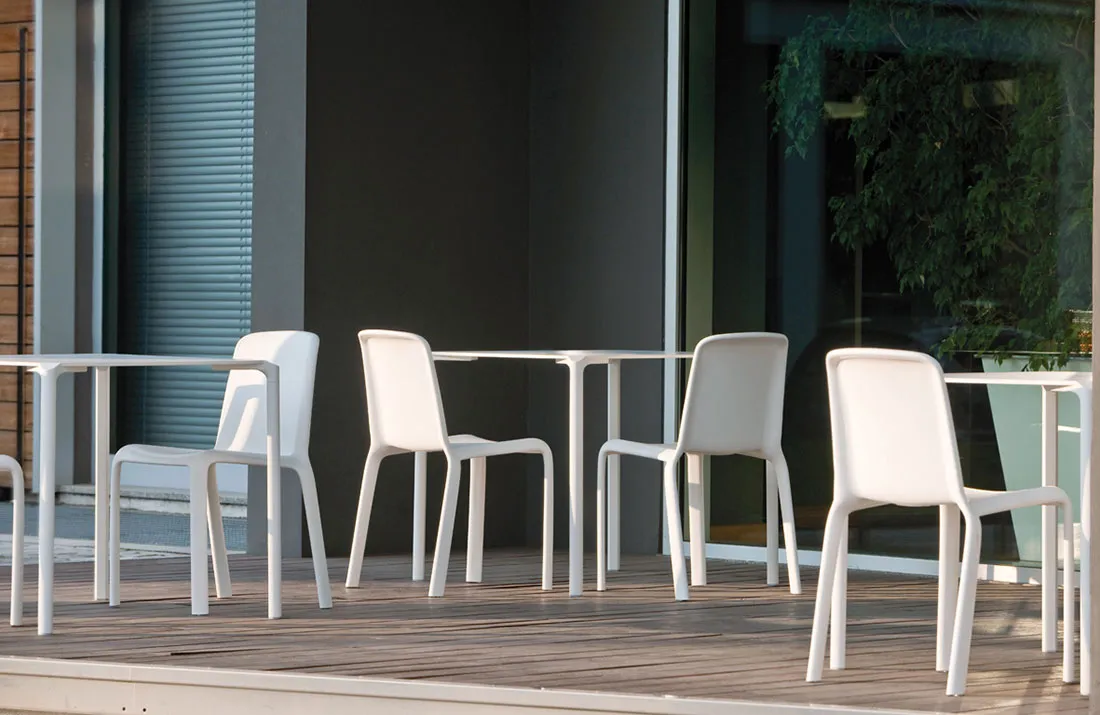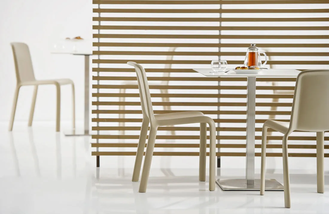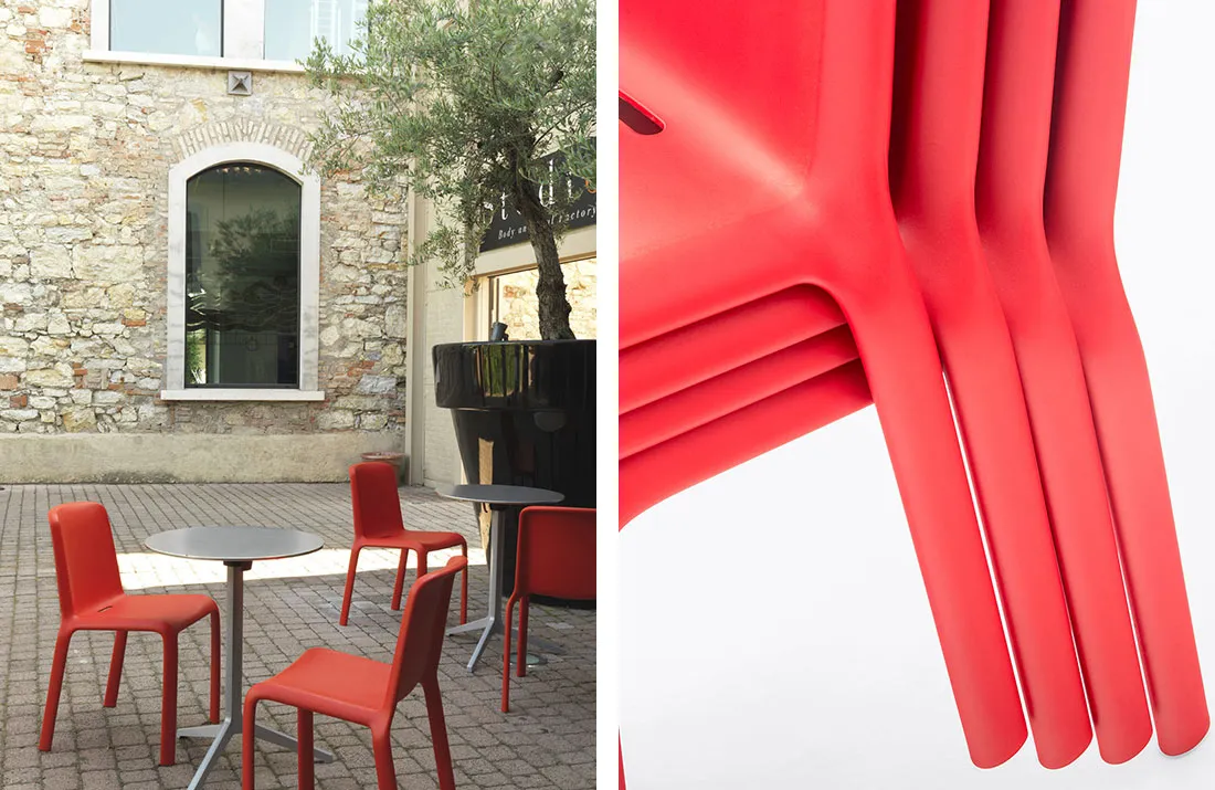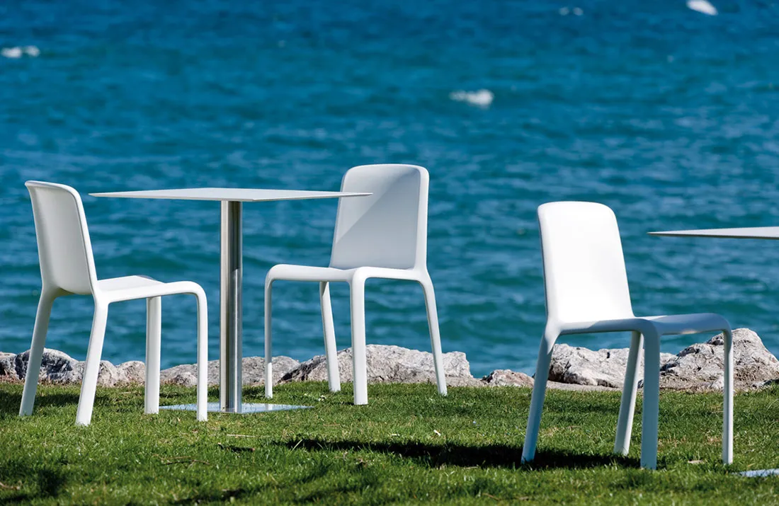 La praticità è un elemento centrale nel design della Snow 300. La sedia è perfettamente impilabile (fino a 8 pezzi su pallet e 12 pezzi in totale), una caratteristica fondamentale per l'ottimizzazione degli spazi in contesti contract o durante eventi. Per l'utilizzo in ambienti esterni, la seduta è dotata di un ingegnoso foro di scolo per l'acqua, che previene i ristagni in caso di pioggia.