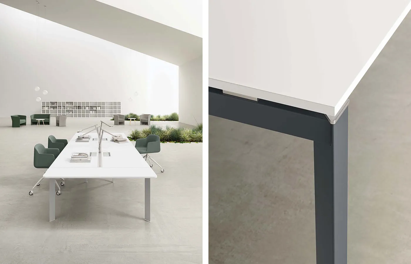 La collezione DV801 Entity è caratterizzata da un design pulito e moderno, dove ogni elemento è pensato per ottimizzare lo spazio e favorire la produttività. Un tratto distintivo è la struttura a ponte con sezione triangolare, un dettaglio che conferisce un tocco di originalità e leggerezza visiva, pur garantendo massima stabilità e robustezza.