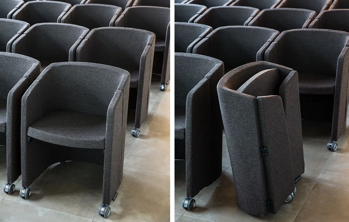 Altro importante plus di Magic è la sua capacità di compattarsi, essendo dotata di fianchi richiudibili e sedile ribaltabile, permettendo quindi l'accatastamento rapido di tante sedie in pochissimo spazio, venendo quindi incontro alle esigenze di chi si trova a gestire situazioni di meeting o riunione con un numero variabile di persone.