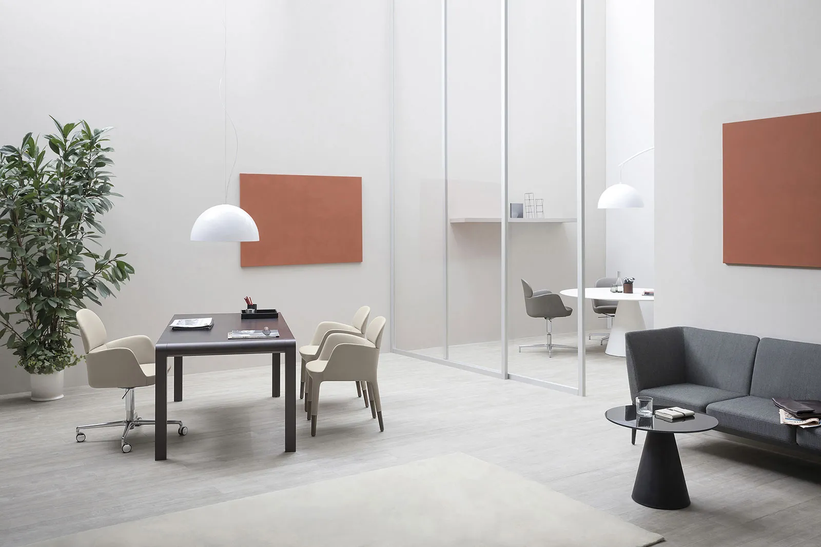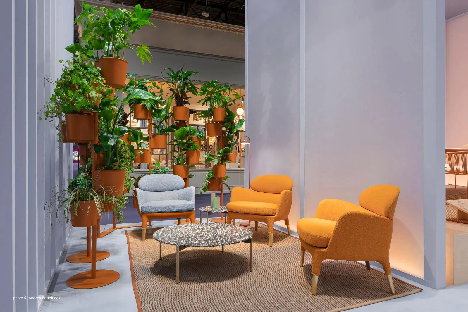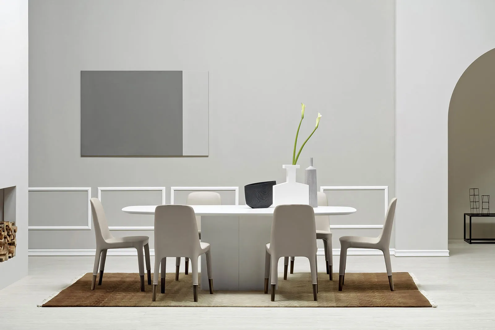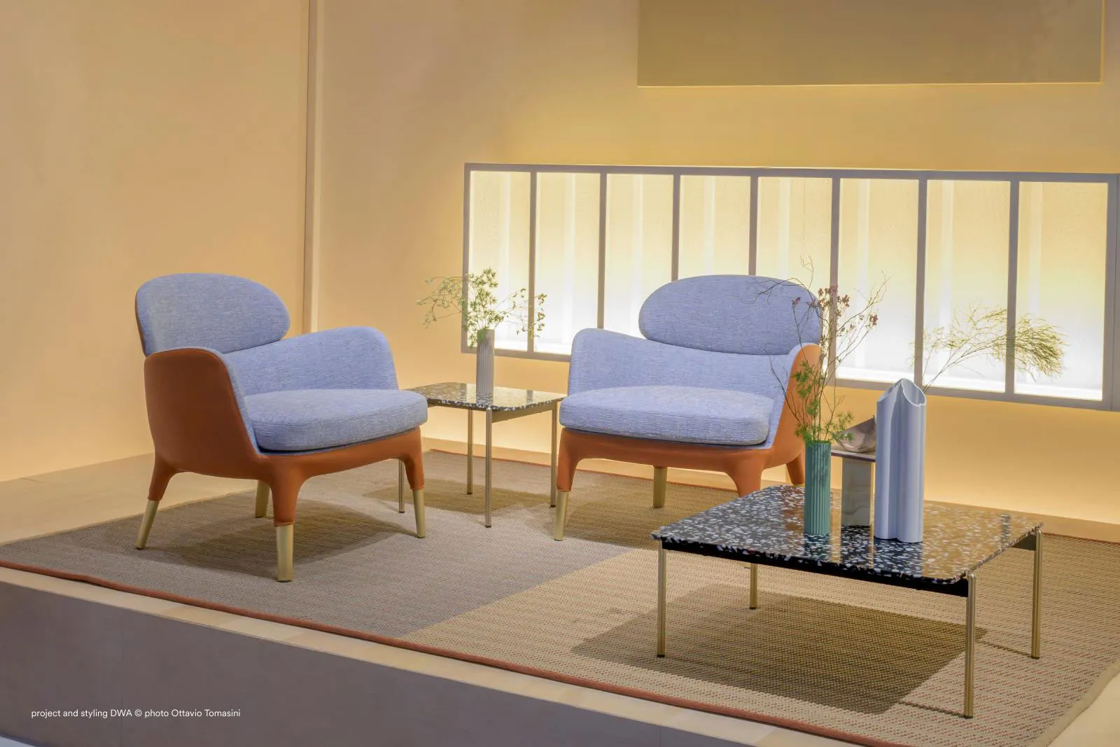 Nel progettare la seduta lounge, la caratteristica forma ovale dello schienale, che distingue la collezione e la rende protagonista all'interno degli ambienti, è stata mantenuta. La silhouette della poltrona prosegue con le forme sinuose ed avvolgenti dei braccioli, terminando a terra con raffinate gambe in pressofusione di alluminio che sintetizzano l'attenzione al dettaglio che impreziosisce l'intera collezione.