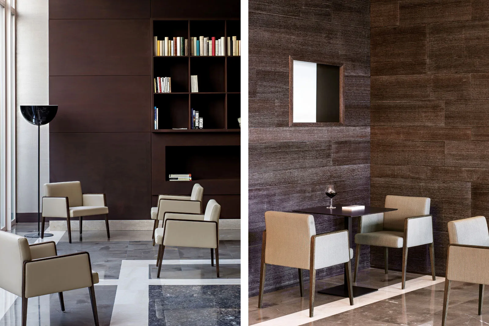 Una famiglia di sedute dall'animo "luxury", caratterizzata da una raffinata attenzione ai dettagli. Poltrona lounge con struttura in rovere, seduta e schienale imbottiti rivestiti in tessuto, pelle o eco pelle.