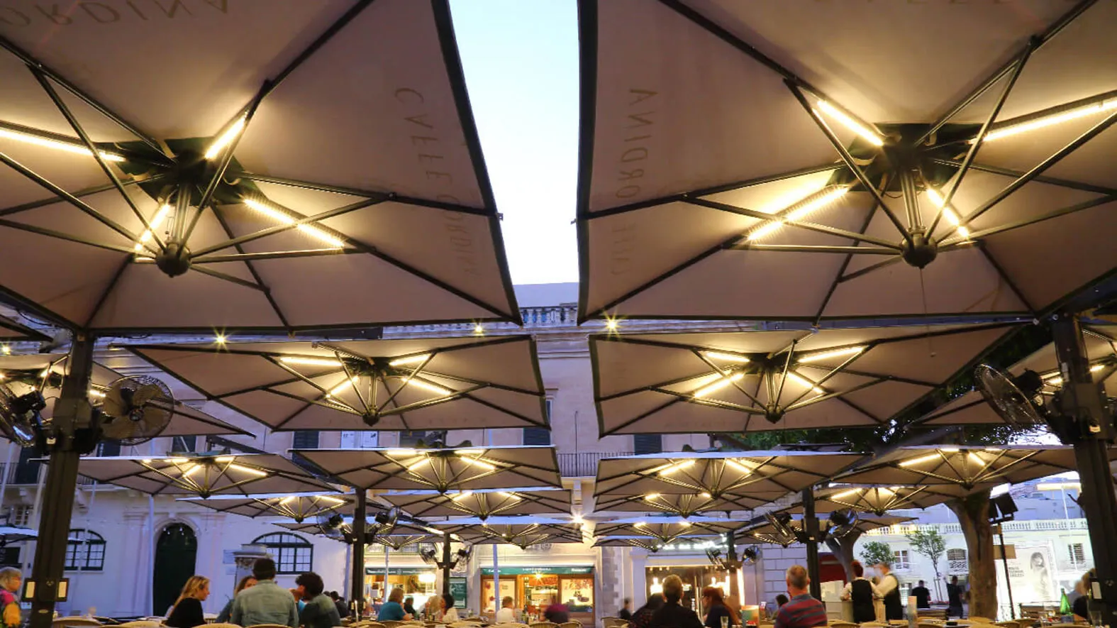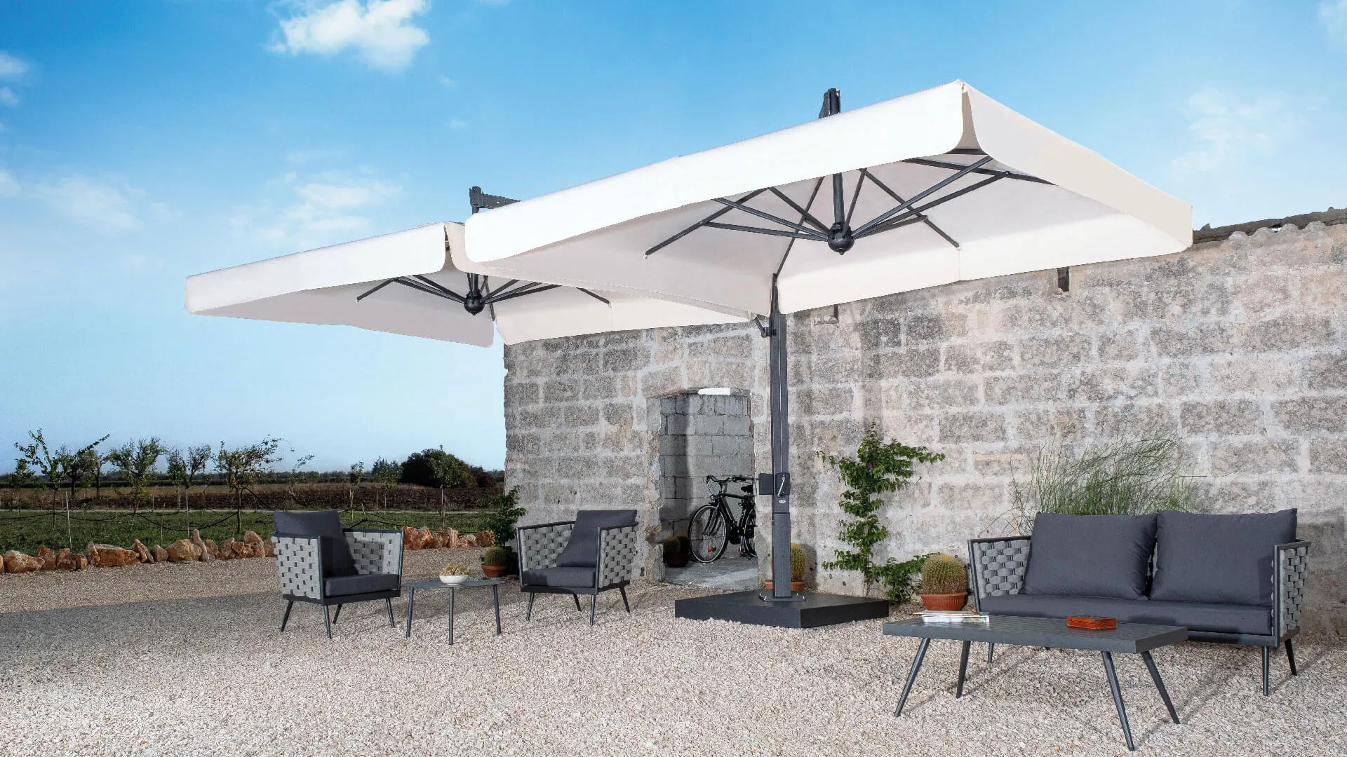 Struttura modulabile in alluminio composta da 2 (Double) o 4 (Poker) ombrelloni ancorati ad un unico sostegno studiata per la copertura di ampie superfici con il minimo ingombro.