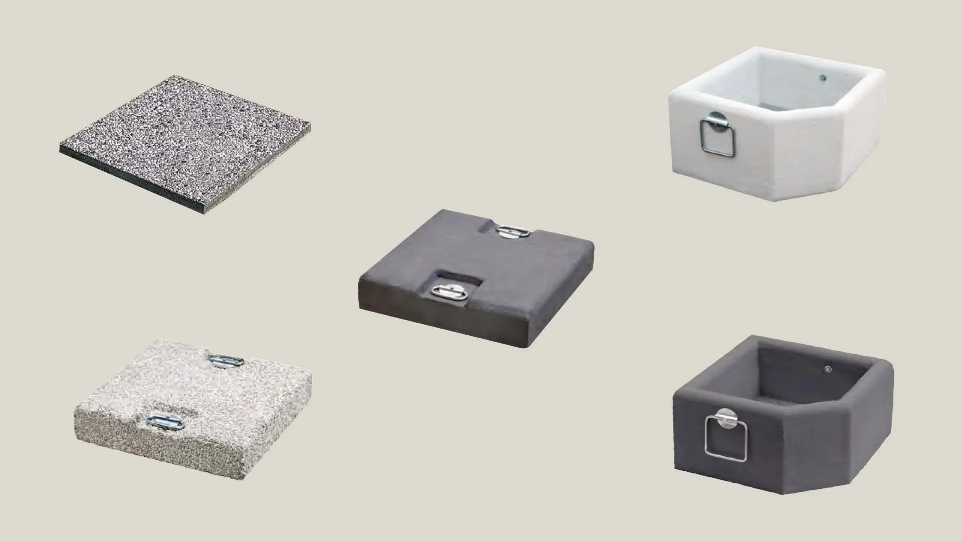 Piastra in cemento grigio con maniglie. Spessore 11cm. Per ombrelloni a braccio. Peso Kg. 60.