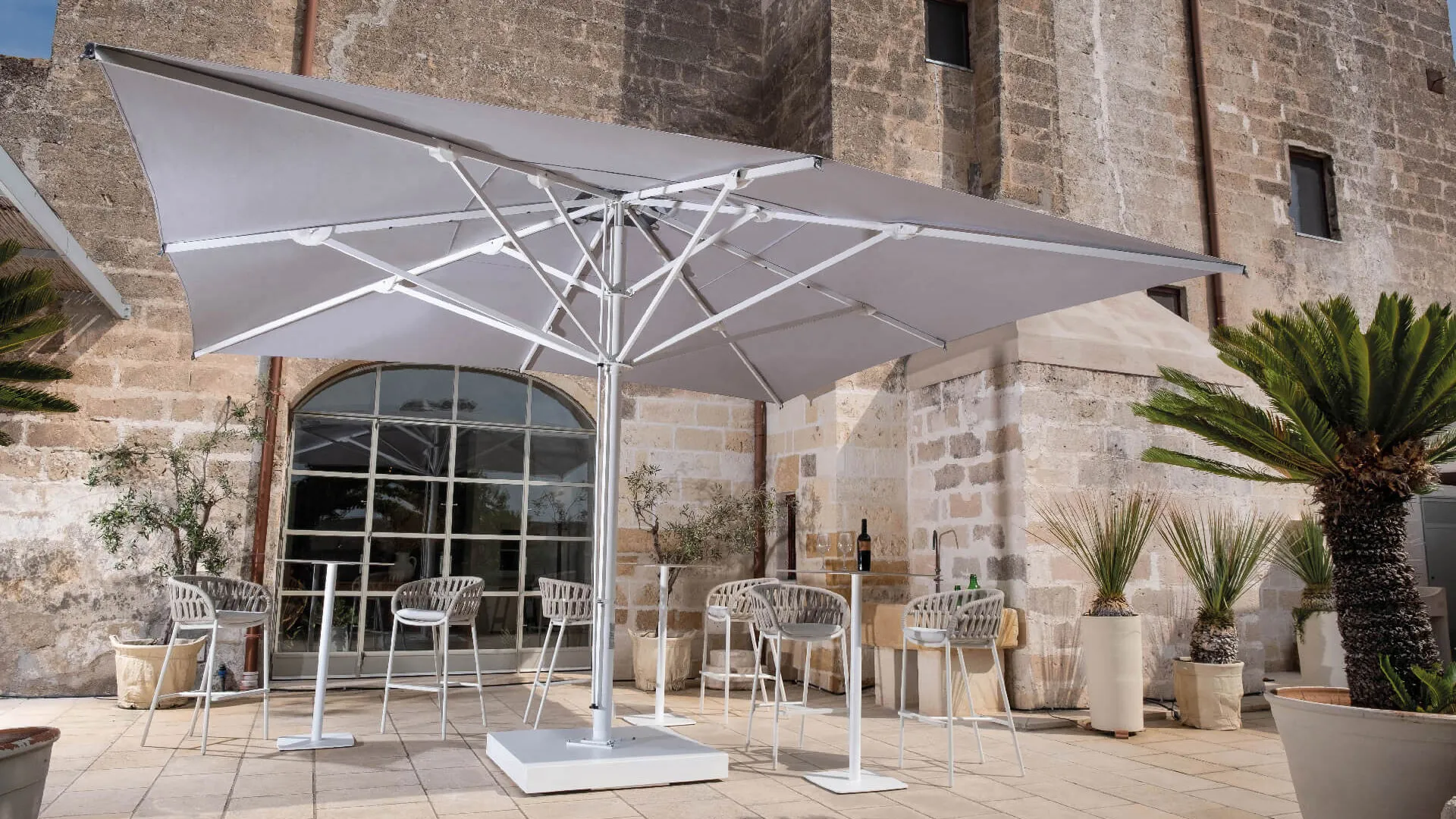 Versione del modello Capri ora disponibile con telaio verniciato a polveri epossidiche colore Starwhite, che rende questo ombrellone elegante e raffinato.