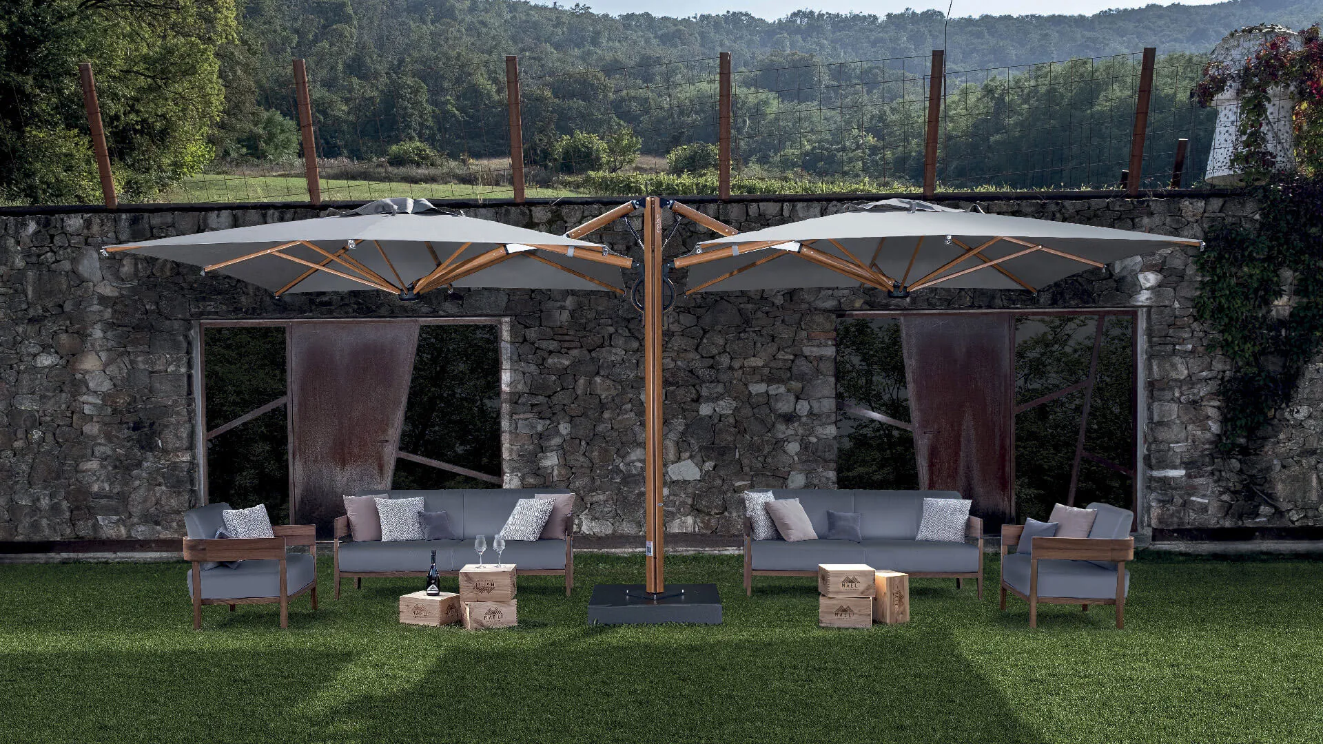 Adatto per tutti gli ambienti e consigliato per uso professionale (bar, ristoranti, hotel e dehor). Telaio in alluminio con verniciatura bianco Starwhite opaco. Struttura robusta composta da 2 ombrelloni affiancati ed ancorati ad un unico sostegno.