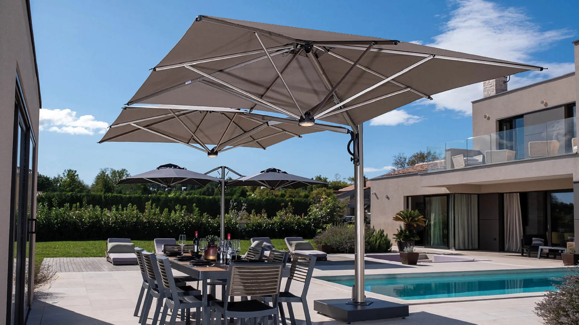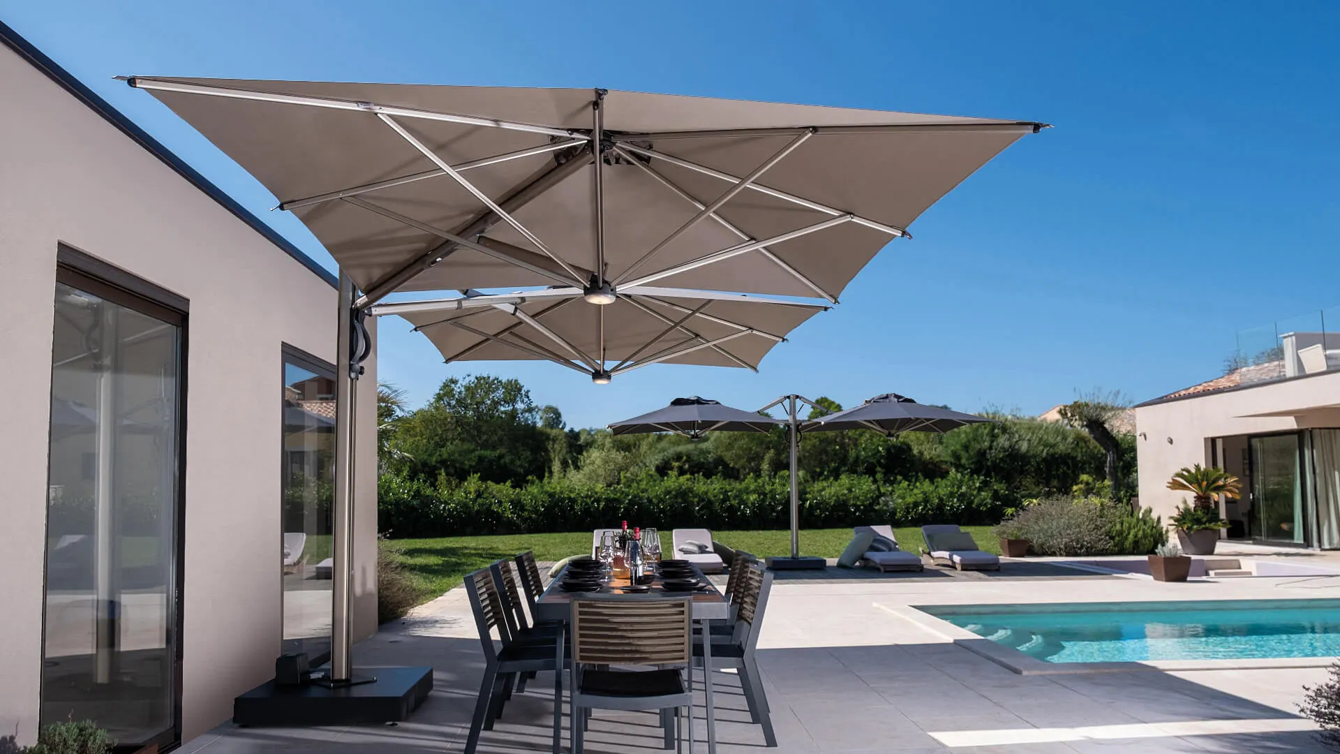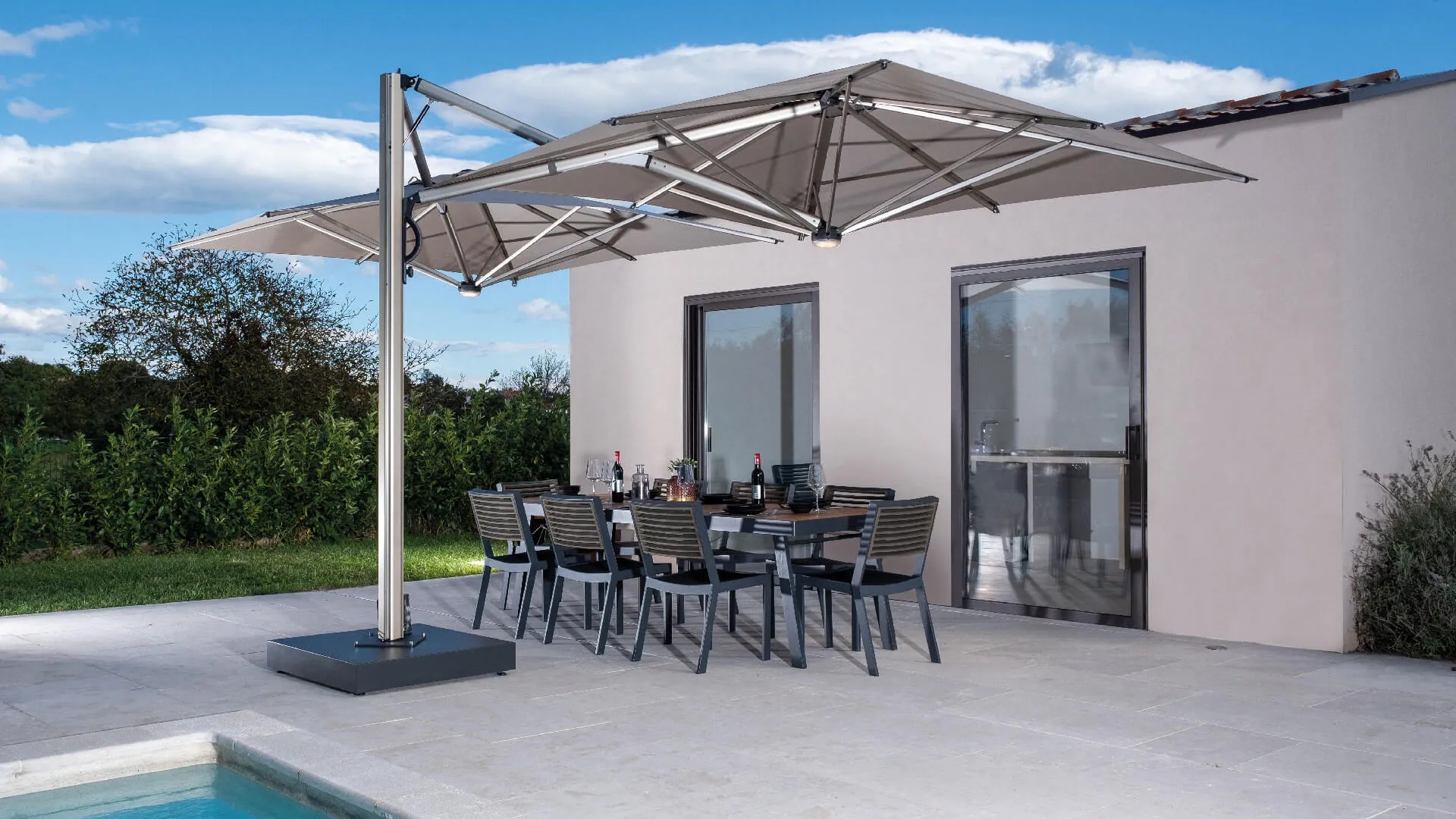 Adatto per tutti gli ambienti e consigliato per uso professionale (bar, ristoranti, hotel e dehor). Telaio in alluminio con verniciatura bianco Starwhite opaco. Struttura robusta composta da 2 ombrelloni affiancati ed ancorati ad un unico sostegno.