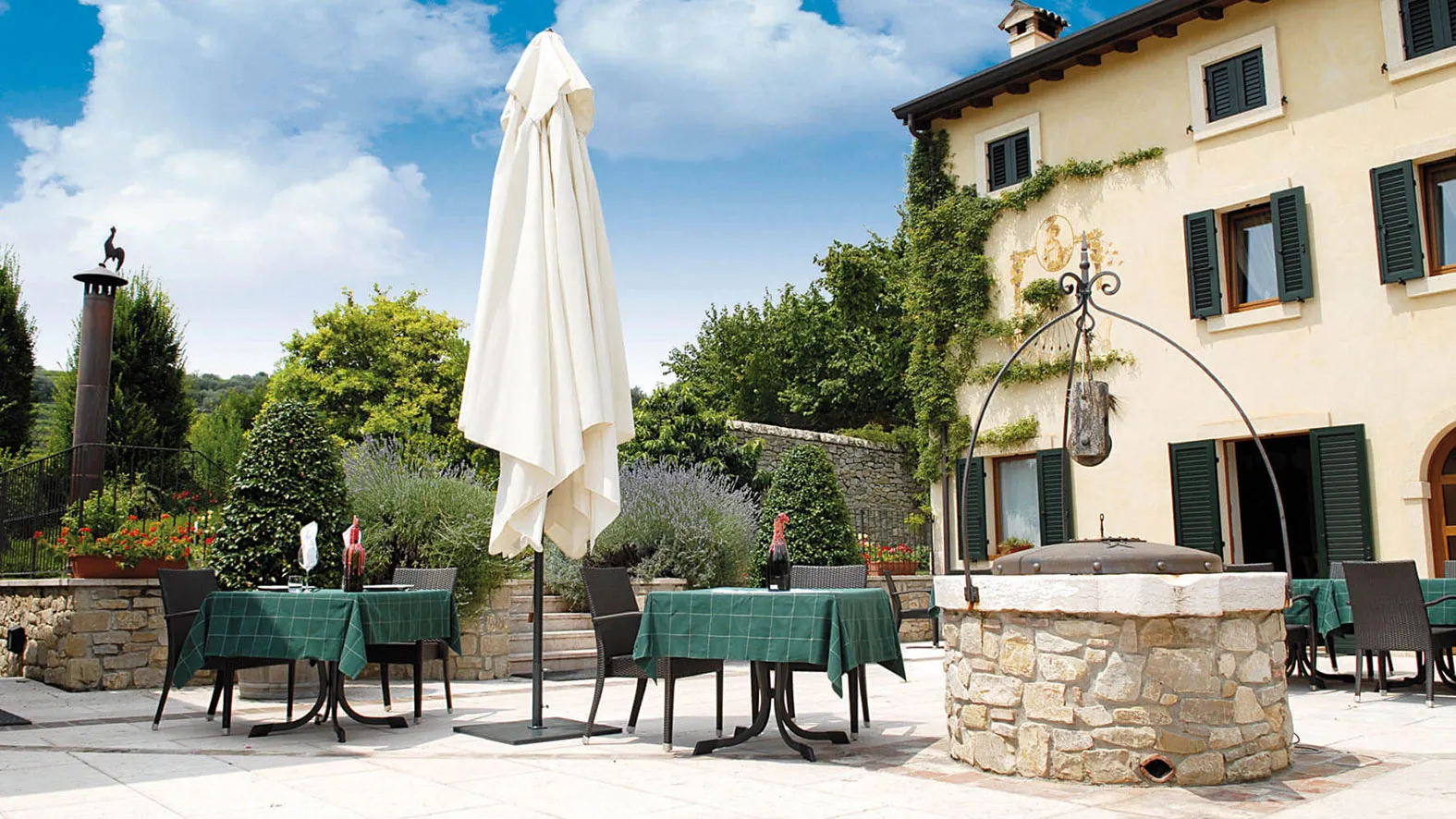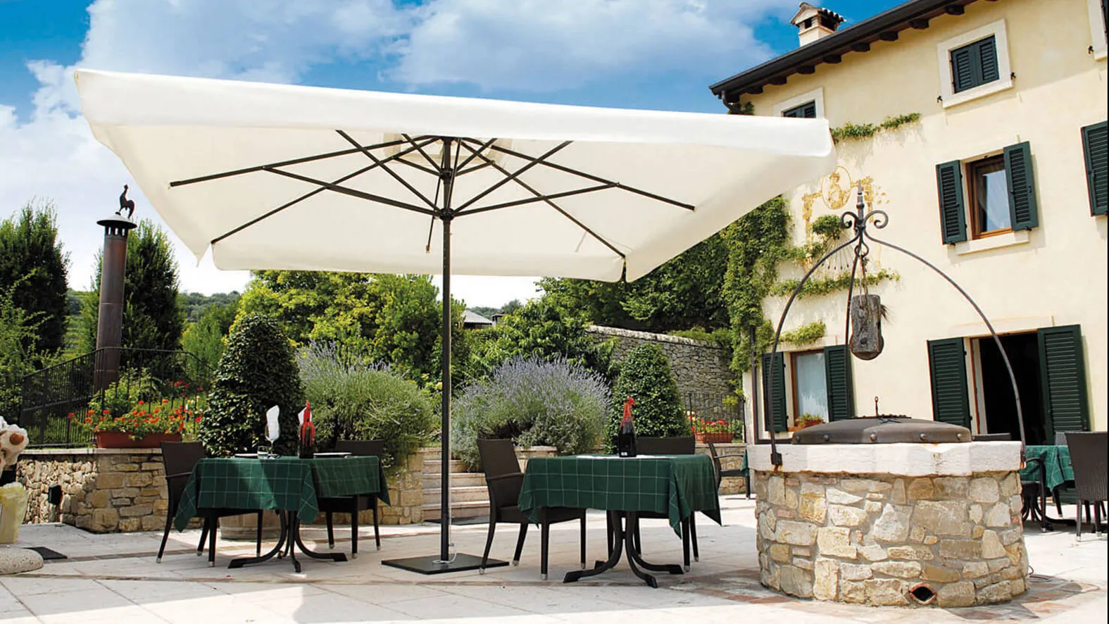 Il sistema telescopico che permette l'apertura e la chiusura al di sopra di tavoli e sedie abbinato al telaio in alluminio rendono l'ombrellone Leonardo Telescopic una scelta di qualità .
