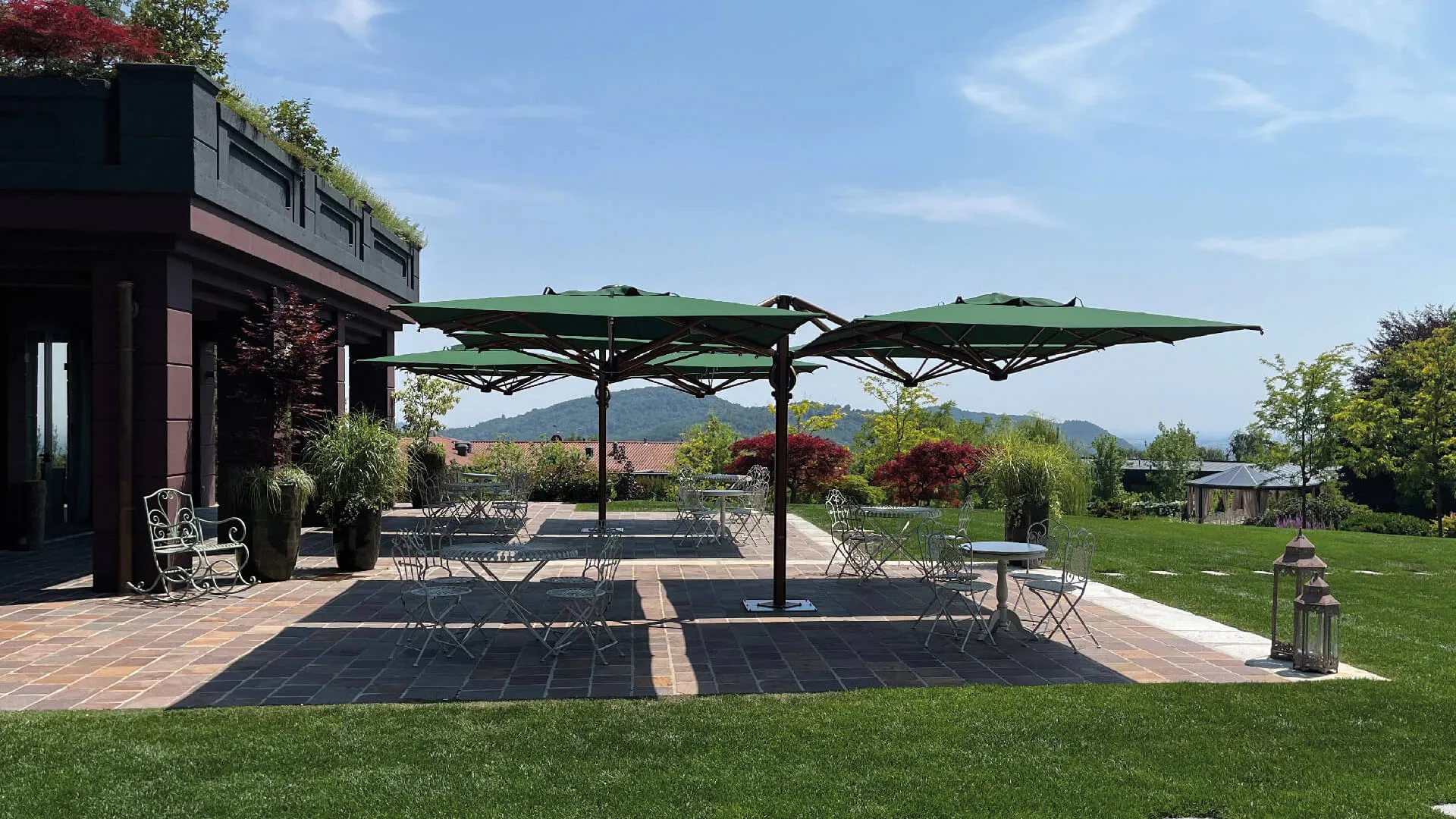 Adatto per tutti gli ambienti e consigliato per uso professionale (bar, ristoranti, hotel e dehor). Telaio in alluminio con verniciatura bianco Starwhite opaco. Struttura robusta composta da 2 ombrelloni affiancati ed ancorati ad un unico sostegno.