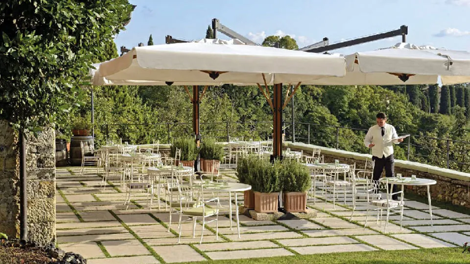 Struttura modulabile in legno composta da 2 (Double) o 4 (Poker) ombrelloni ancorati ad un unico sostegno studiata per la copertura di ampie superfici con il minimo ingombro.