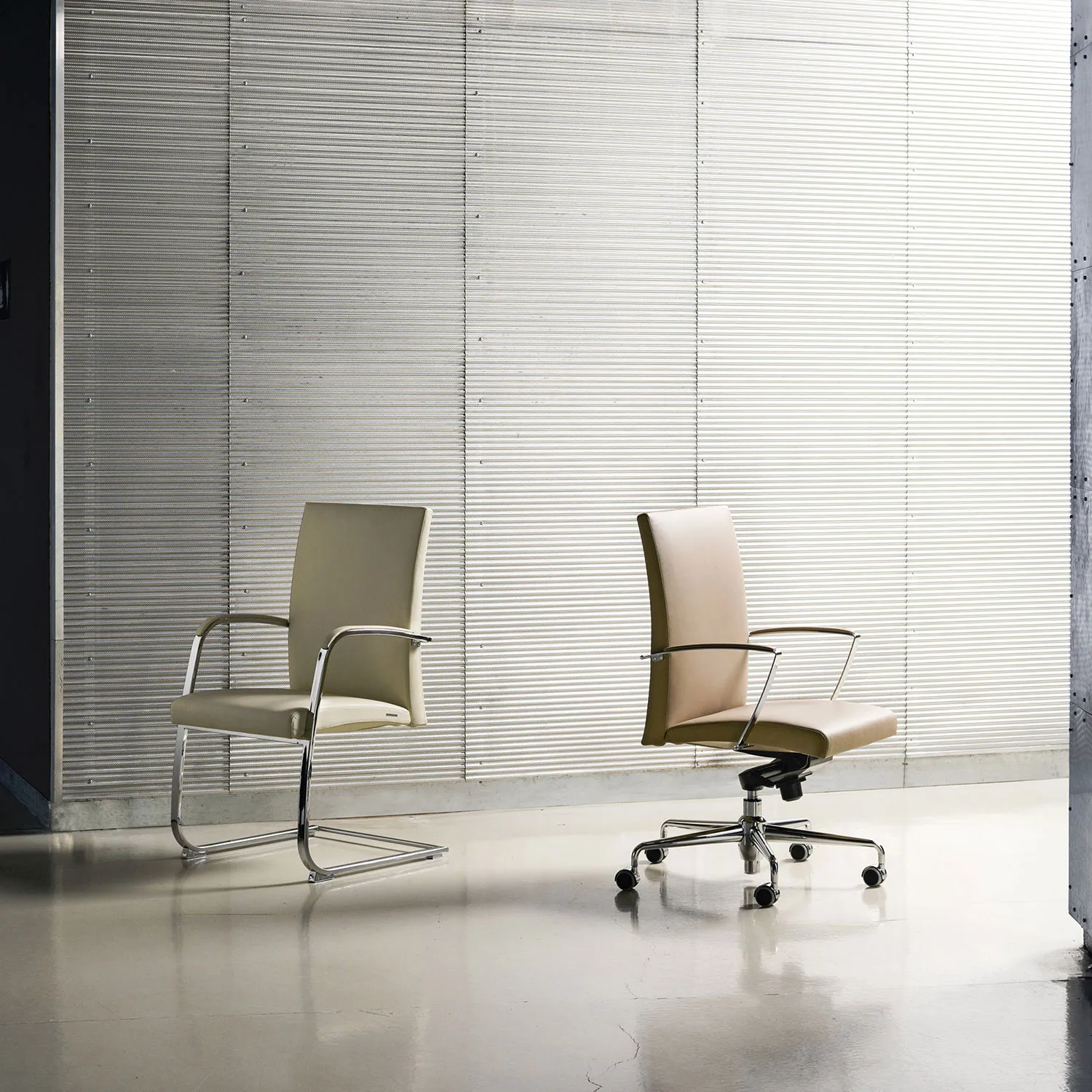 Viva Moving offre basi a 5 razze in alluminio lucidato o ferro cromato (Ø 710mm) per la versione direzionale, e una base a slitta in acciaio rettangolare per la versione Visitor??.